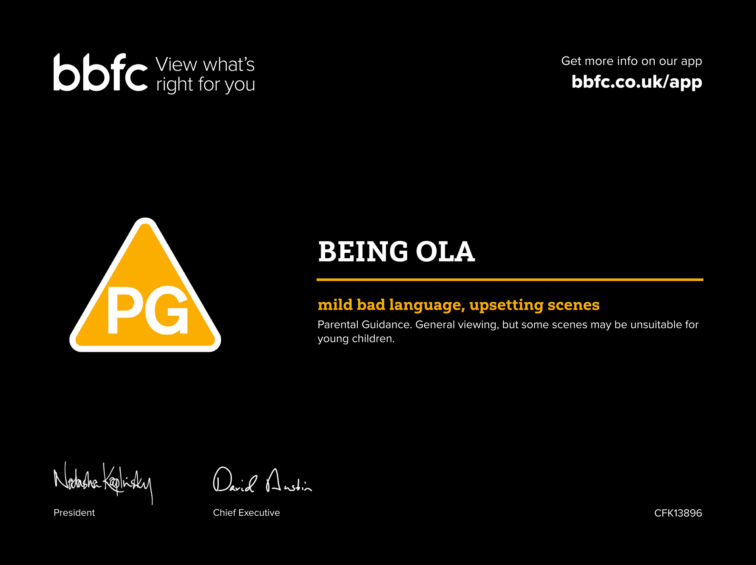 Please note that Being Ola is certified PG. The film is listed as 12A in our printed programme, but this has since been updated to PG.